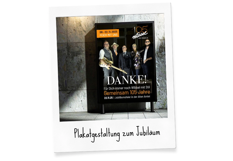 Mit der Jubiläumskampagne „105 Jahre Wibbel“ entstand ein ganzheitliches Kommunikationspaket, das Geschichte erlebbar und Marke fühlbar macht – regional sichtbar, emotional spürbar und authentisch. Der Abschlussabend in der Alten Amtei bildete den emotionalen Höhepunkt einer Kampagne, die Tradition, Stil und Gemeinschaft eindrucksvoll miteinander verband.